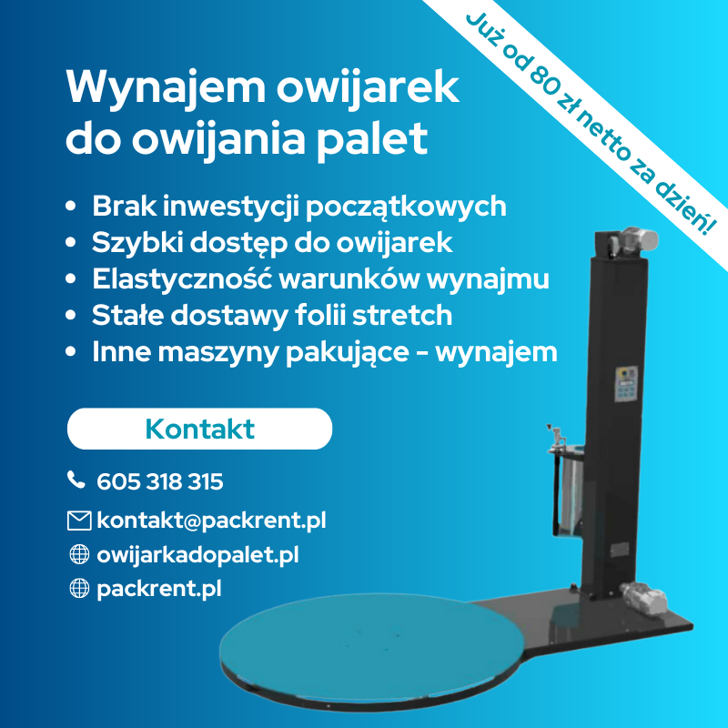 Wynajmij owijarkę talerzową z rampą na 2 miesiące, ładunki do 1200 kg, 80 palet/dobę, montaż i szkolenie w Poznaniu, start od 15.10. Z folią od dostawcy. Dane: XXXX Sp. z o.o., NIP 1234567890, kontakt: jan.kowalski@XXXX.pl, +48 600 000 000.